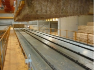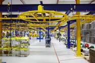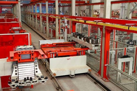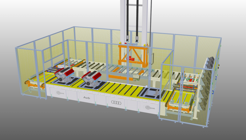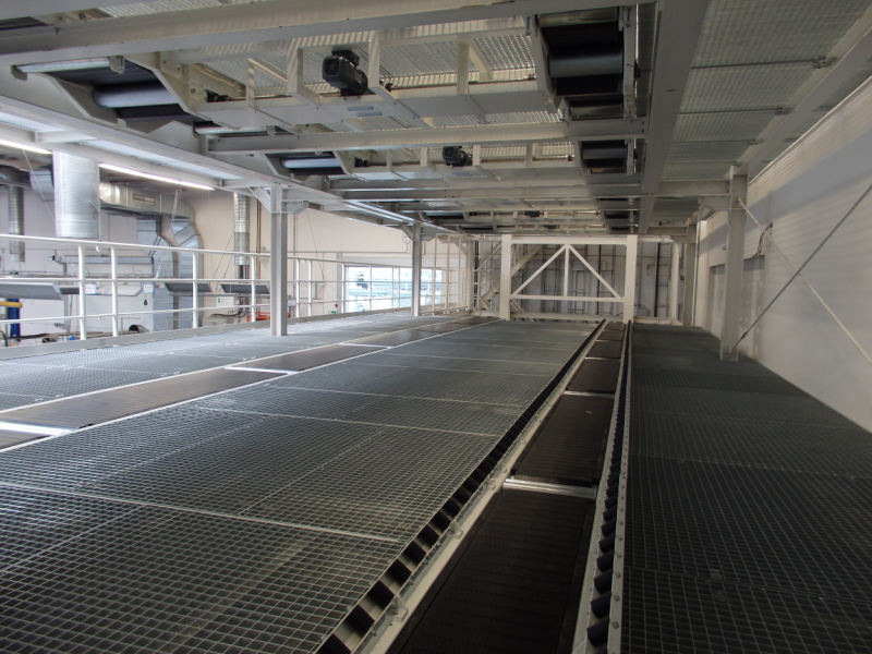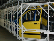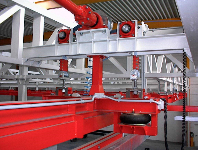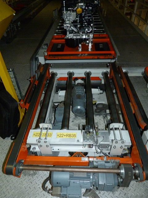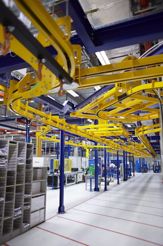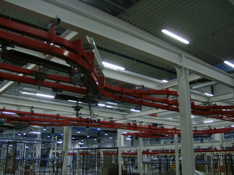 P & F (Power and Free) típusú konvejor feladó berendezéssel a teherautó-alváz gyártó soron.