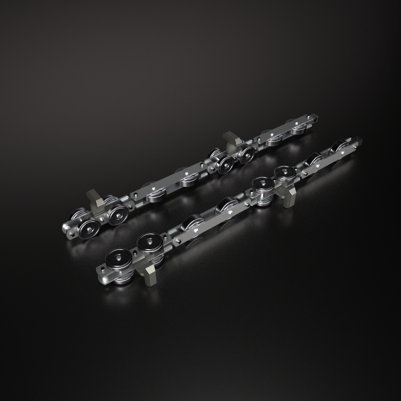A vezetőtag és a tehertag a láncegységben feszítőhüvellyel lett összekötve. A futó és a terelőgörgők egysoros golyóscsapággyal lettek szerelve.